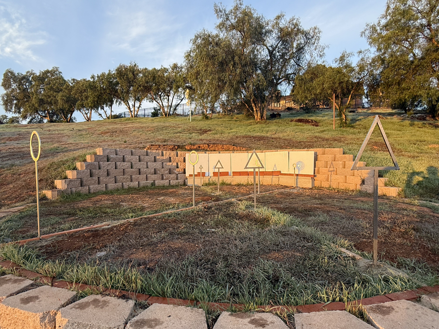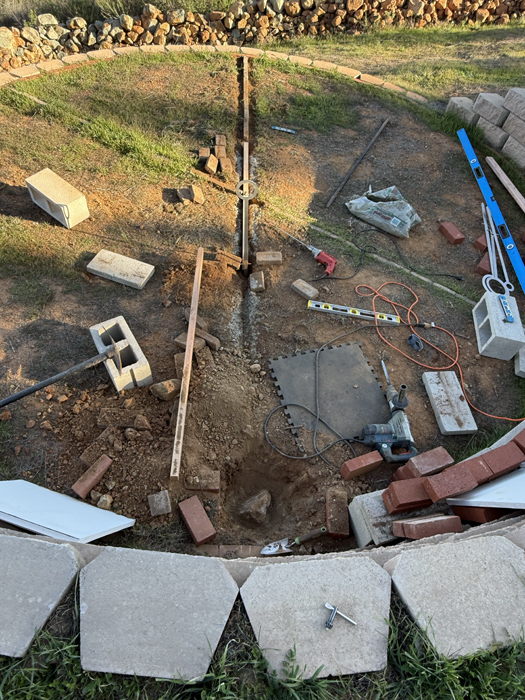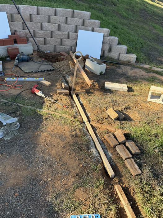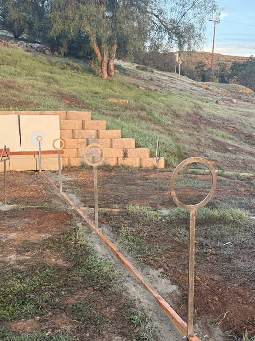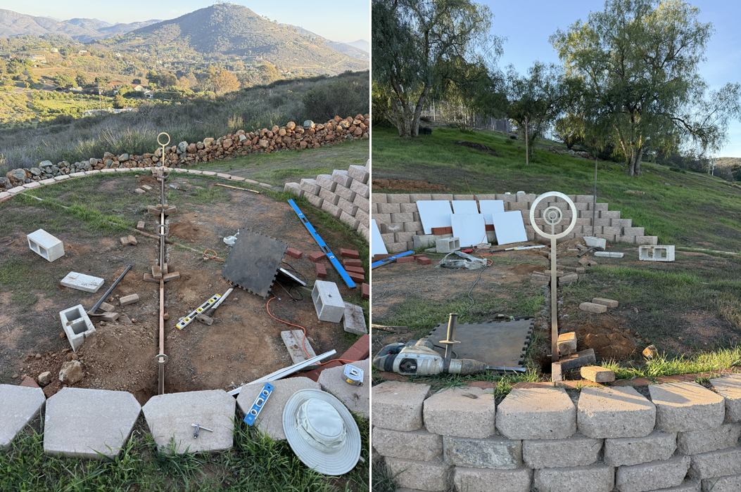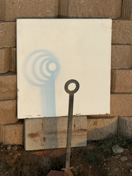Today I began the installtion of the new Winter Solstice Circular Shadow Casters. The previous shadow casters were not precisely placed apart along the winter solstice line made of bricks. While my long term goal is to use stainless steel for the solstice line, I'm switching to wood for now, cut to exacting lengths to control the spacing of the shadow casters. The prior shadow caster supports were placed to one side of the brick solstice line with hardware enabling the circles to be roughly centered over the solstice line. The new shadow casters are being placed directly within the solstice line.